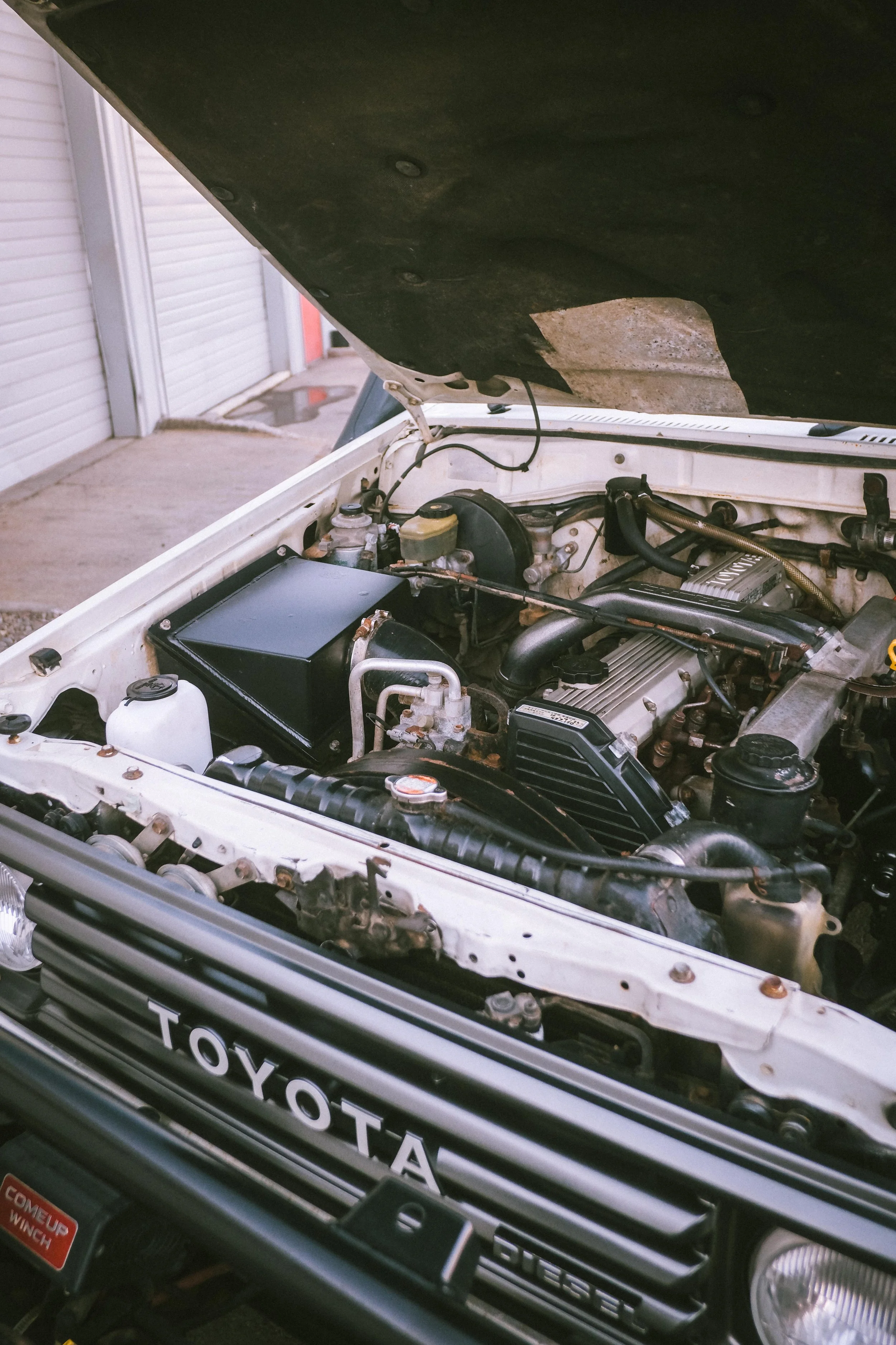 The tired 1HZ was removed and replaced with a Toyota 1HD-T engine. Direct injection, it starts and runs excellent. Bottom end bearings were replaced, along with a new G-turbo and all new seals, gaskets, etc. Neither the engine or transmission leaks.
